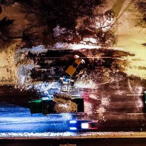 11月11日晚,在通遼市城區,作業車輛連夜清理積雪(無人機照片)。
