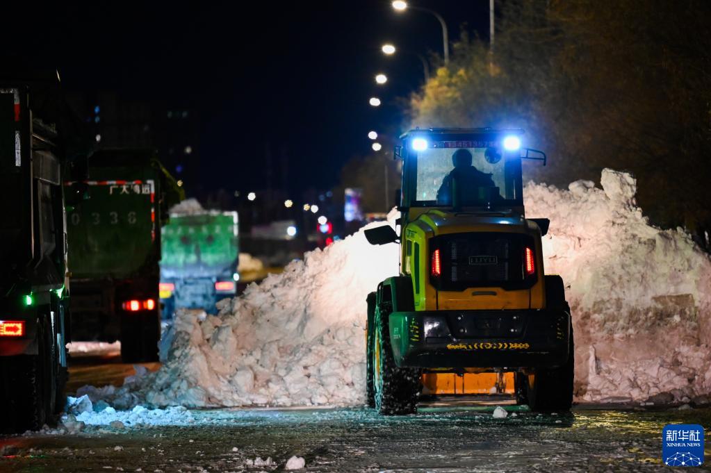 11月11日晚,在通遼市城區,作業車輛連夜清理積雪。