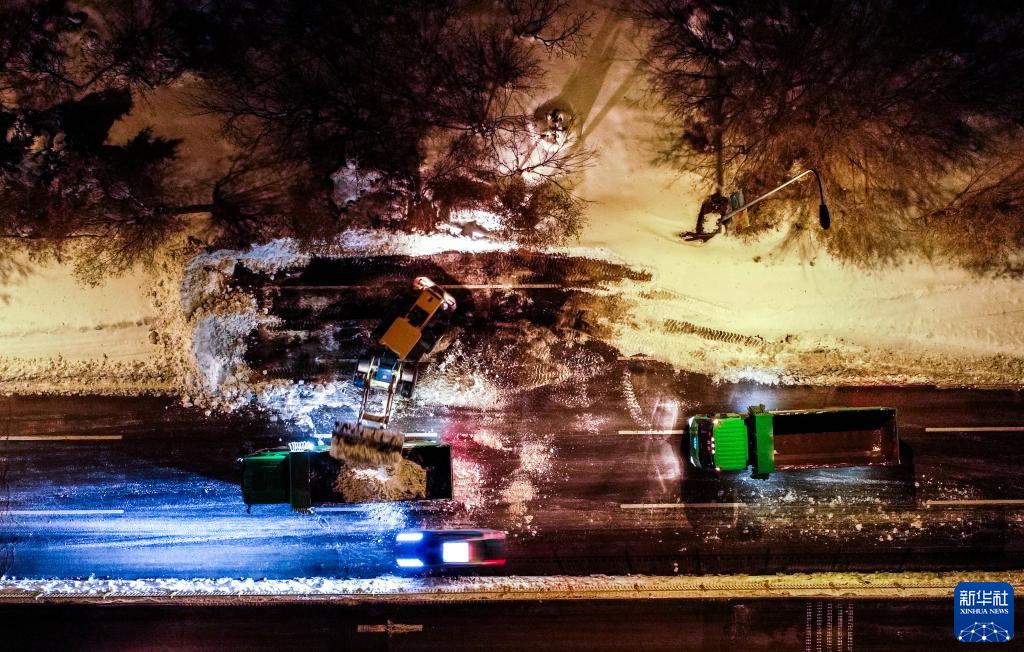 11月11日晚,在通遼市城區(qū),作業(yè)車輛連夜清理積雪(無人機照片)。