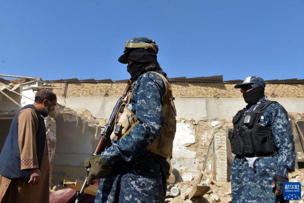 11月15日,阿富汗塔利班成員在坎大哈查看打擊“伊斯蘭國”武裝分子行動后受損的房屋。