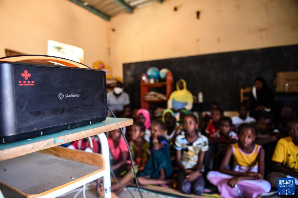 11月22日,在塞內(nèi)加爾達喀爾近郊的辛迪亞小學,同學們課間坐在教室的地毯上觀看投影播放的動畫片。