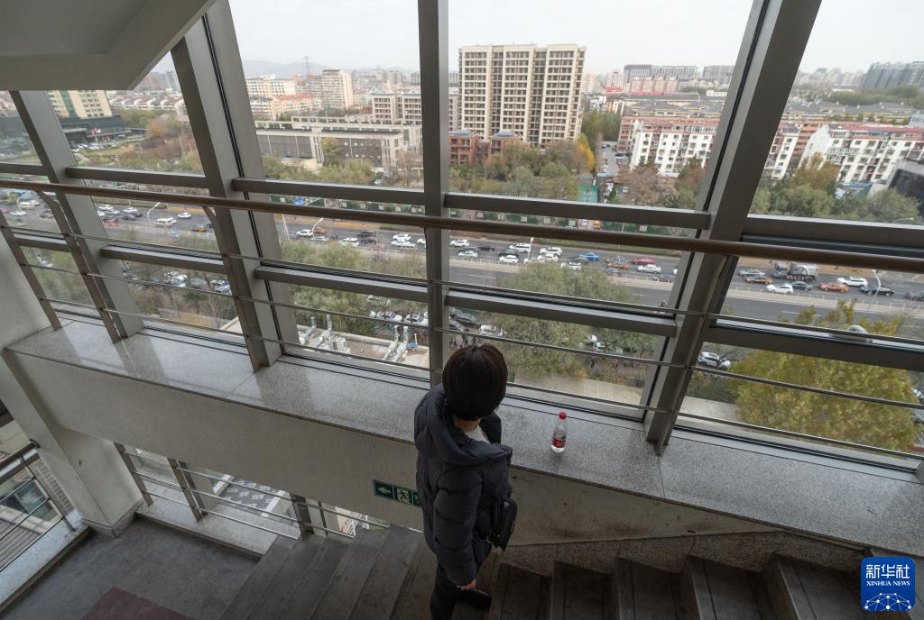 11月15日,在北京大學腫瘤醫院手術室旁的樓梯間,吳姝在等待媽媽手術結束。