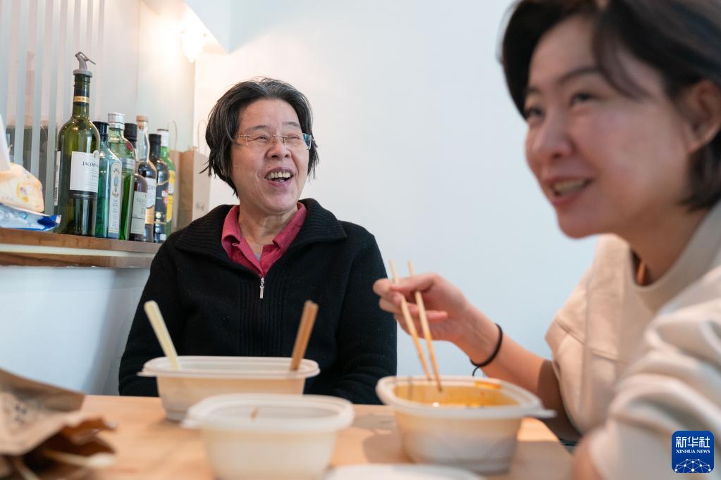 11月24日,剛剛出院的沈建群(左)在北京的住所內(nèi)與女兒吳姝一起吃飯。
