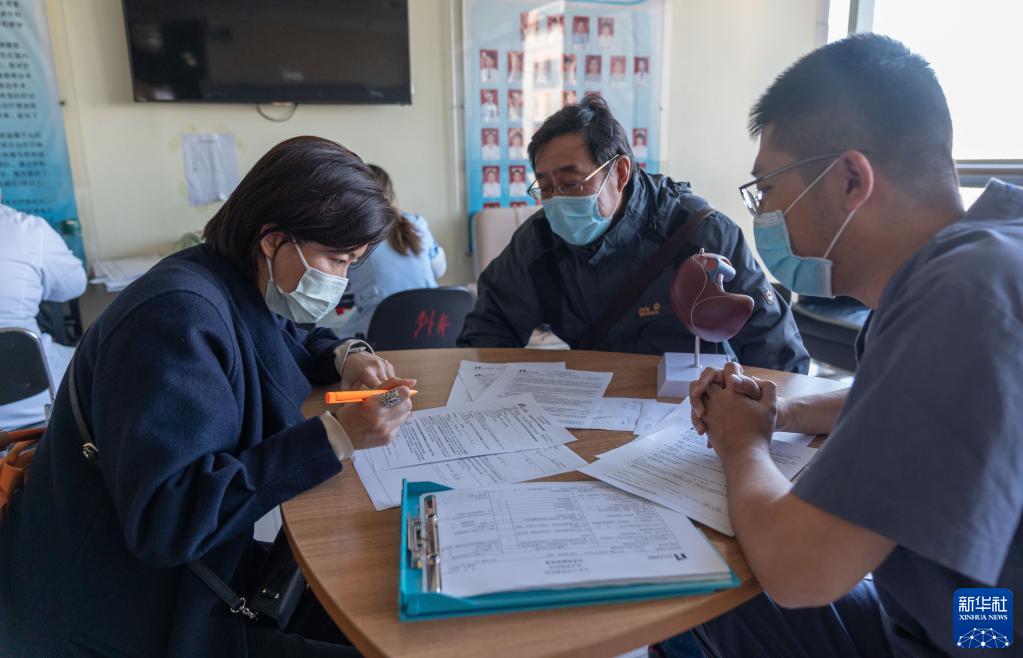 11月12日,在北京大學腫瘤醫(yī)院肝膽胰外一科病房,沈建群的女兒吳姝(前左)簽署手術(shù)同意書等材料。