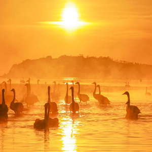 冬日清晨,山東榮成大天鵝國家級自然保護區晨霧裊裊,大天鵝在晨曦中游弋覓食、起舞飛翔,吸引眾多游客前來觀賞拍照。