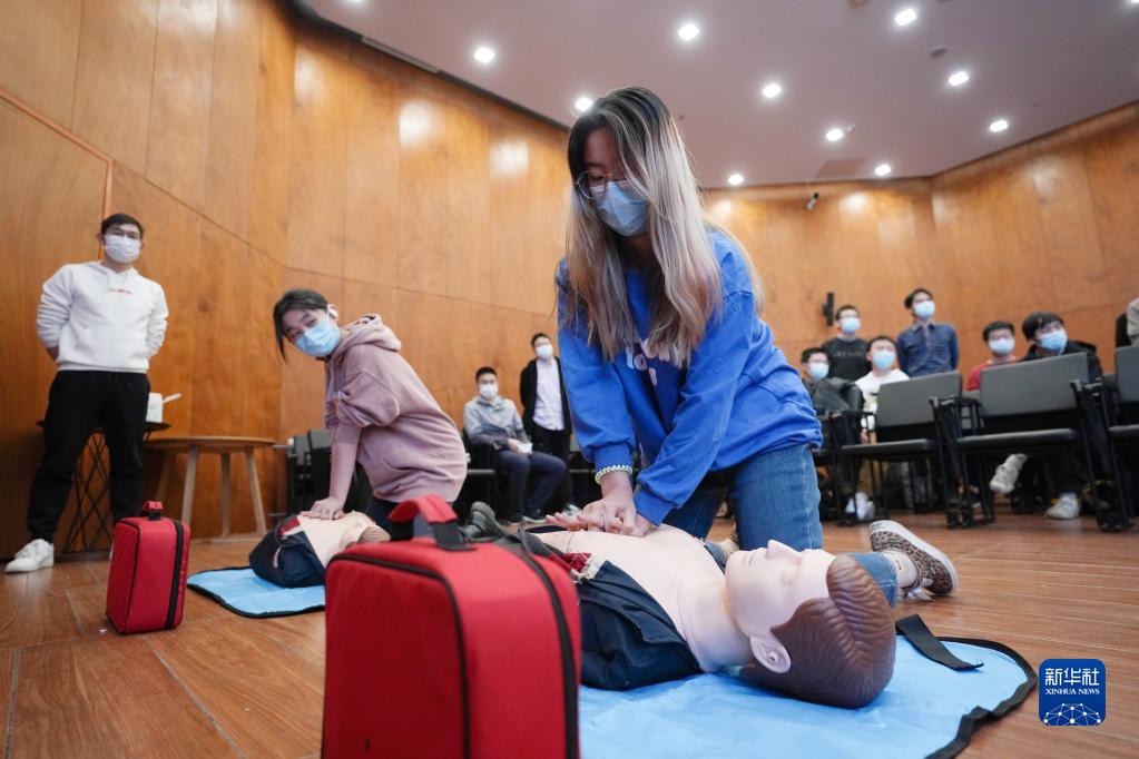 11月28日,清華大學計算機系的冬奧學生志愿者遆周杰(右)在急救技能培訓上學習心肺復蘇術。新華社記者 鞠煥宗 攝