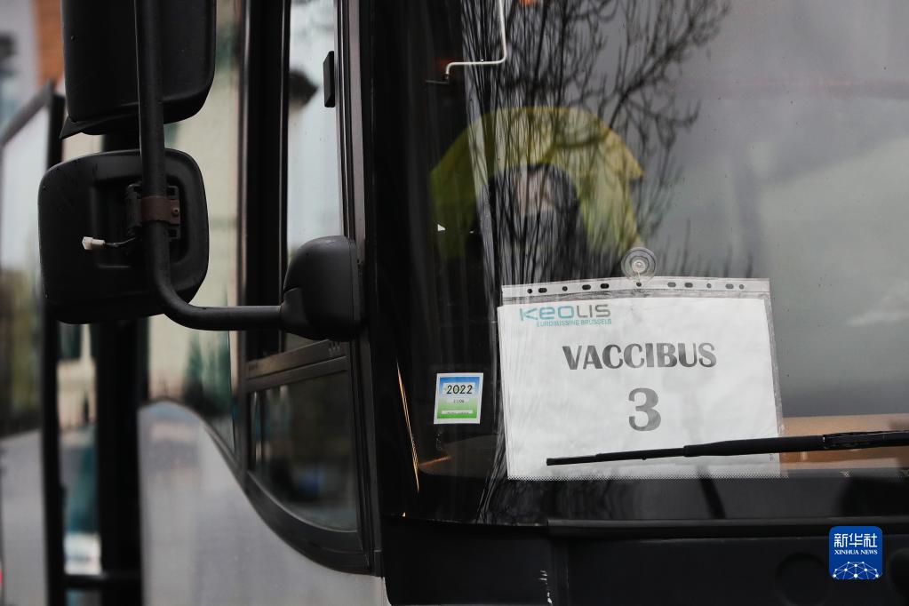 這是11月30日在比利時布魯塞爾拍攝的一輛新冠疫苗接種巴士。