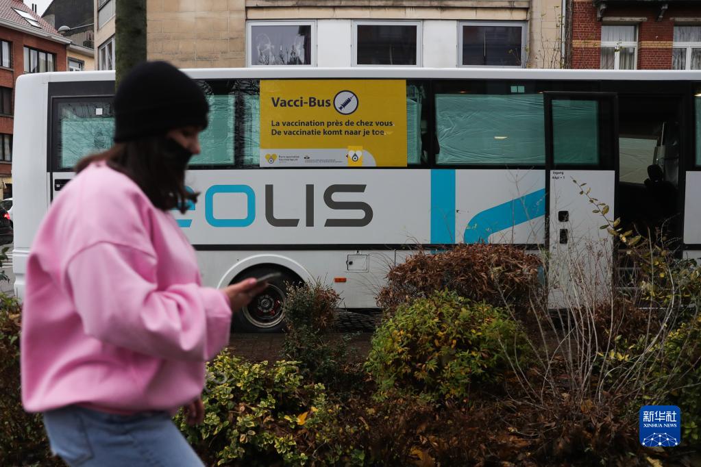 11月30日,一名女子經過比利時布魯塞爾的一輛新冠疫苗接種巴士。