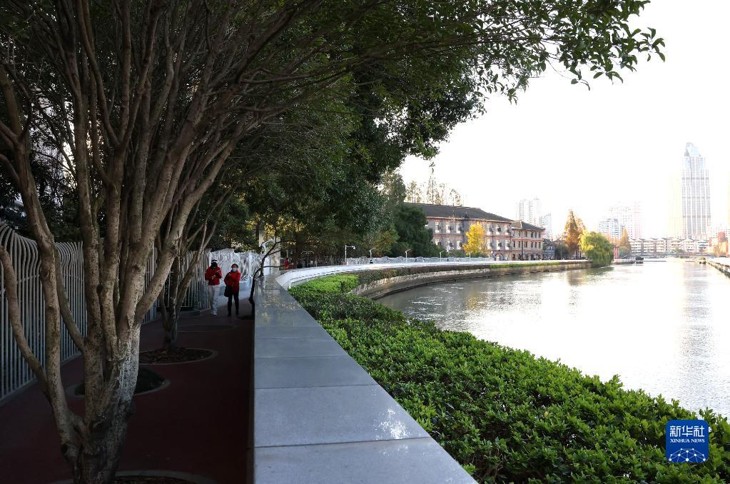 12月1日,游人在蘇州河畔的華東政法大學濱河步道休閑。