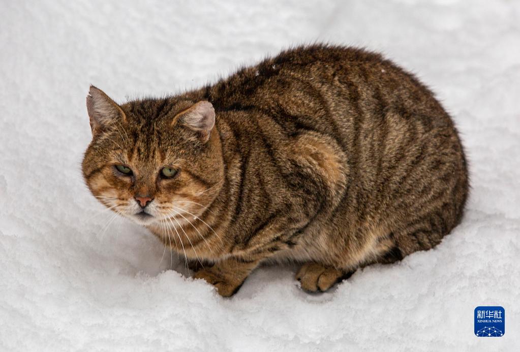 這是12月1日在拉脫維亞里加拍攝的雪中的貓。