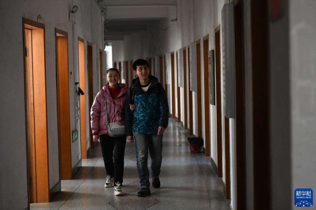 12月2日,在安慶師范大學(xué)音樂學(xué)院,唐聞澤陪著張晨(左)去練琴。