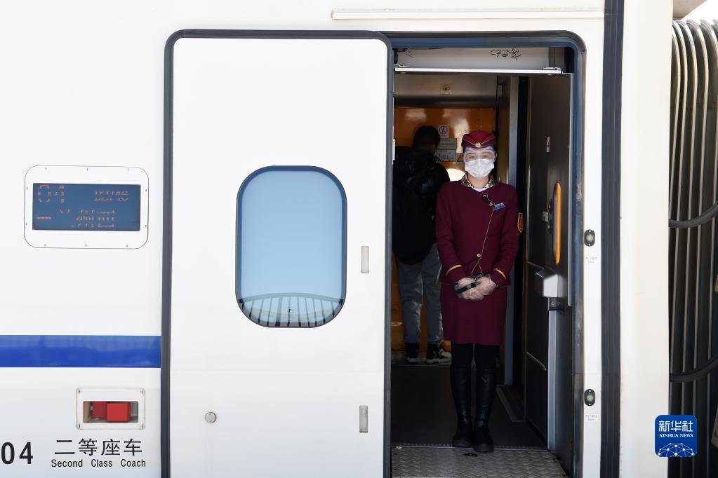 12月5日,在蘭新高鐵山丹馬場站,列車員等待列車關(guān)閉車門發(fā)車。新華社記者 范培珅 攝