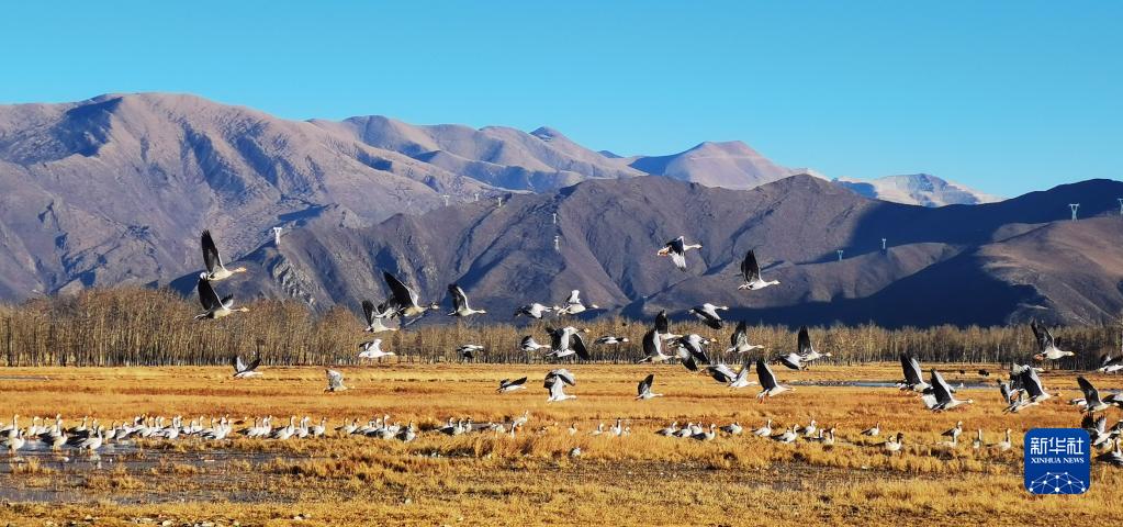 唐嘎鄉位于拉薩市達孜區東北部,這里每年冬季都會迎來黑頸鶴、斑頭雁、赤麻鴨等候鳥。這些在此越冬的“客人”和周邊的田園、濕地共同構成高原冬季美景。