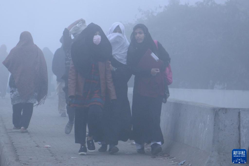 12月15日,學(xué)生們走在大霧彌漫的巴基斯坦拉合爾街頭。
