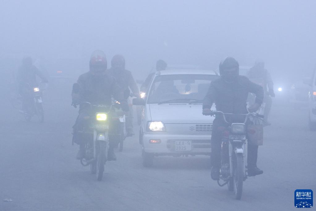 12月15日,機動車在大霧彌漫的巴基斯坦拉合爾街頭行駛。