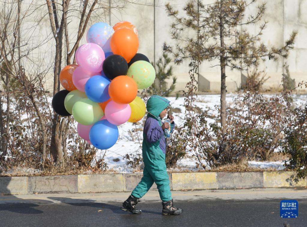 12月16日,一名男孩在雪后的阿富汗喀布爾街頭售賣氣球。新華社發(塞夫拉赫曼·薩菲攝)