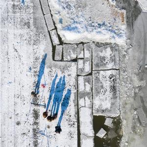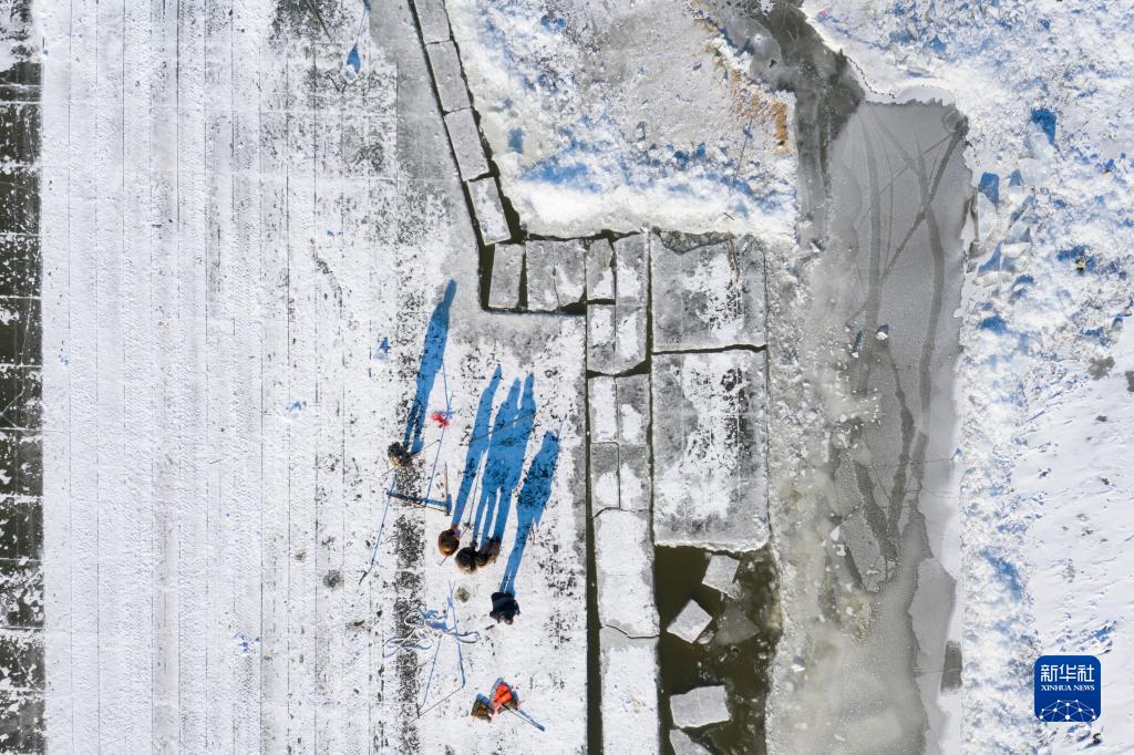 在松花江哈爾濱段,工人在進行切割和采冰工作(12月17日攝,無人機照片)。