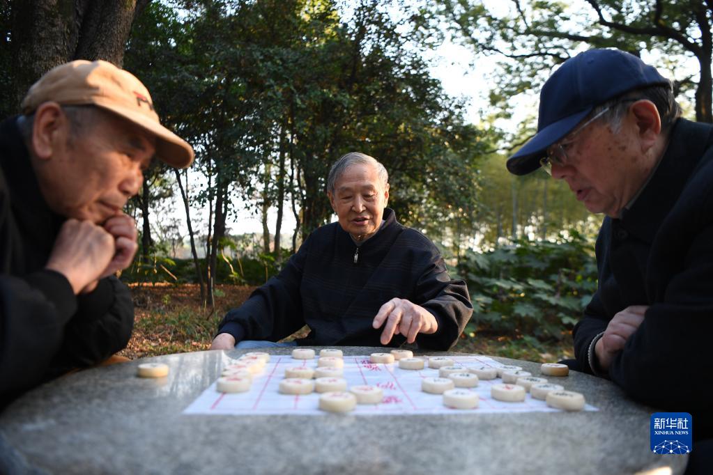 12月22日,馬利民(左)、魏鎮(右)在公園里下象棋,余國基在一旁觀戰。新華社記者 薛宇舸 攝