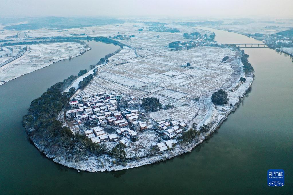 12月27日拍攝的江西省宜春市上高縣新界埠鎮(zhèn)的雪景(無(wú)人機(jī)照片)。