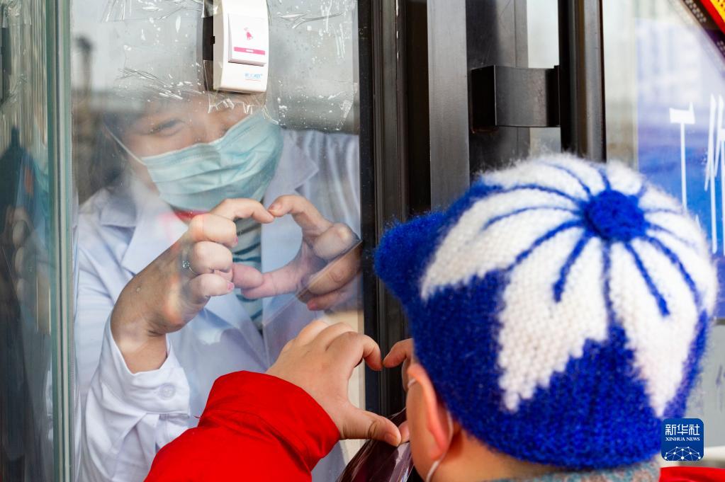 2021年2月11日,在黑龍江省哈爾濱市道外區(qū)一集中隔離點,鄭瑩瑩和兒子順順隔著玻璃門“比心”。鄭瑩瑩是哈爾濱市道外區(qū)人民醫(yī)院一名工作人員,正在一處集中隔離點值守。除夕上午,6歲的兒子順順來到隔離點,給她帶來了一朵康乃馨。因疫情防控需要,母子倆隔著賓館的玻璃門相望,完成了特殊的“除夕團圓”。