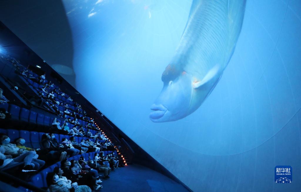 2021年5月2日,游客在上海科技館影院內觀看球幕電影《大堡礁探秘》。