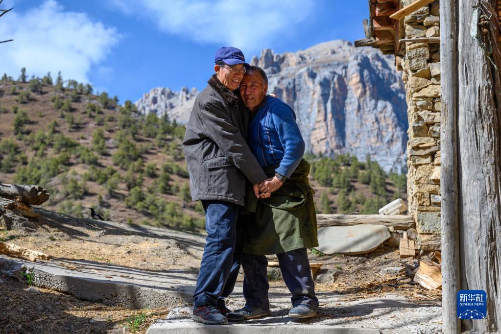 2021年5月3日,李純民前往西藏昌都市類烏齊縣伊日鄉崩日村看望1979年下鄉工作時結識的房東一家。這是房東的大兒子澤仁多加(右)在家門口熱情歡迎他。1979年,李純民響應國家號召來到類烏齊縣工作,自此與西藏結緣。2001年到2006年,李純民每年都會向青藏鐵路指揮部捐款;過去十幾年里,李純民幾乎每年都要進藏開展助學活動。