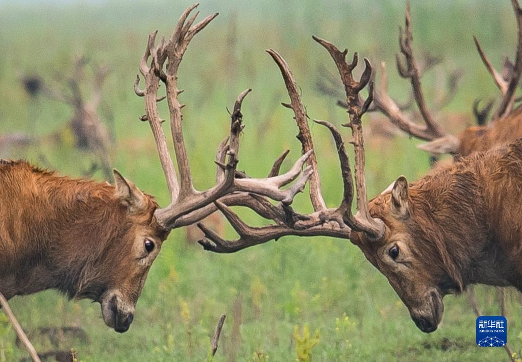 2021年5月17日,麋鹿在位于湖北省天鵝洲長江故道邊的石首麋鹿國家級自然保護區內活動。