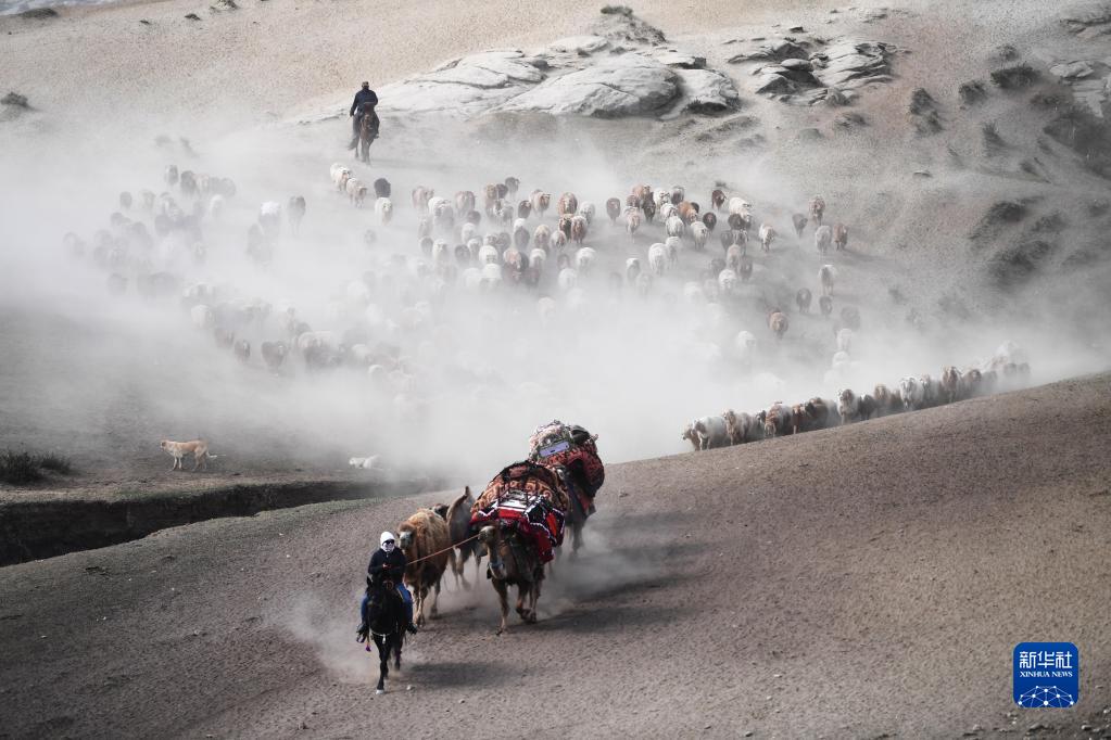 2021年6月5日,在新疆阿勒泰地區(qū)福海縣沙爾布拉克春秋牧場(chǎng)的牧道上,牧民帶著駝隊(duì),引著牲畜向夏季牧場(chǎng)遷徙。