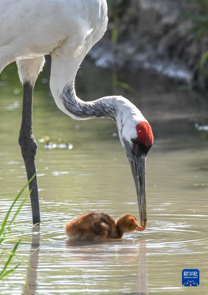 2021年6月20日至21日,一對由吉林莫莫格國家級自然保護區管理局人工繁育的丹頂鶴,在野化放歸后成功繁殖出兩只雛鶴。這是6月21日,丹頂鶴給雛鶴喂食。