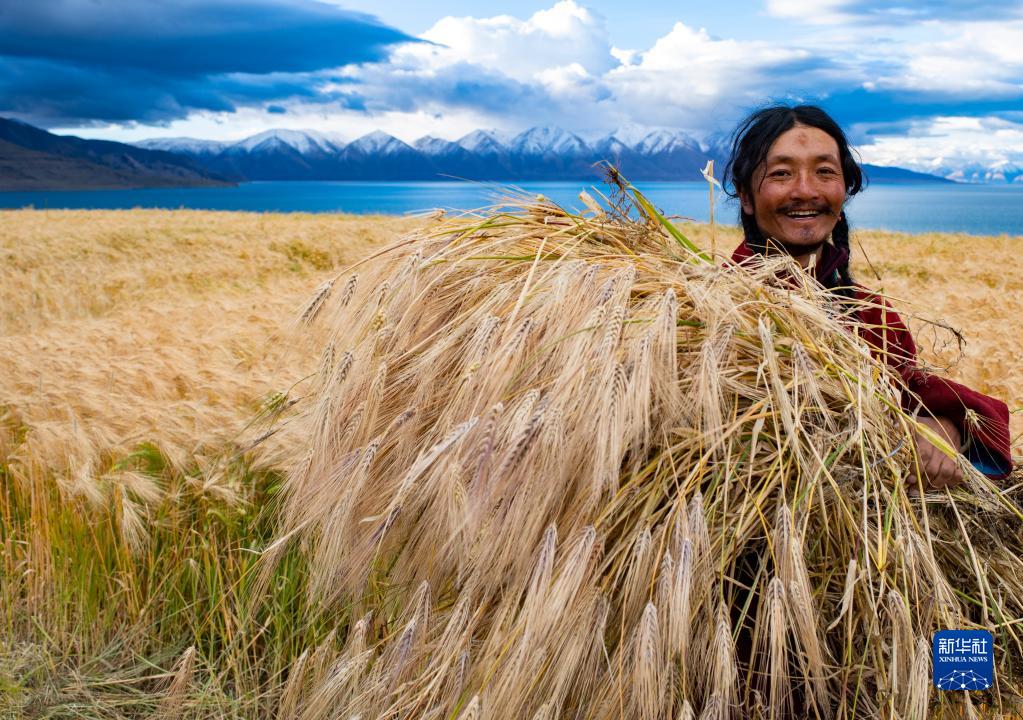 2021年9月23日,西藏那曲市尼瑪縣文部鄉(xiāng)文部南村村民開鐮收割。文部南村位于當(dāng)惹雍措湖畔,海拔4645米,這里的村民以“薩馬卓”(半農(nóng)半牧之意)為主,在藏北高原獨具特色。