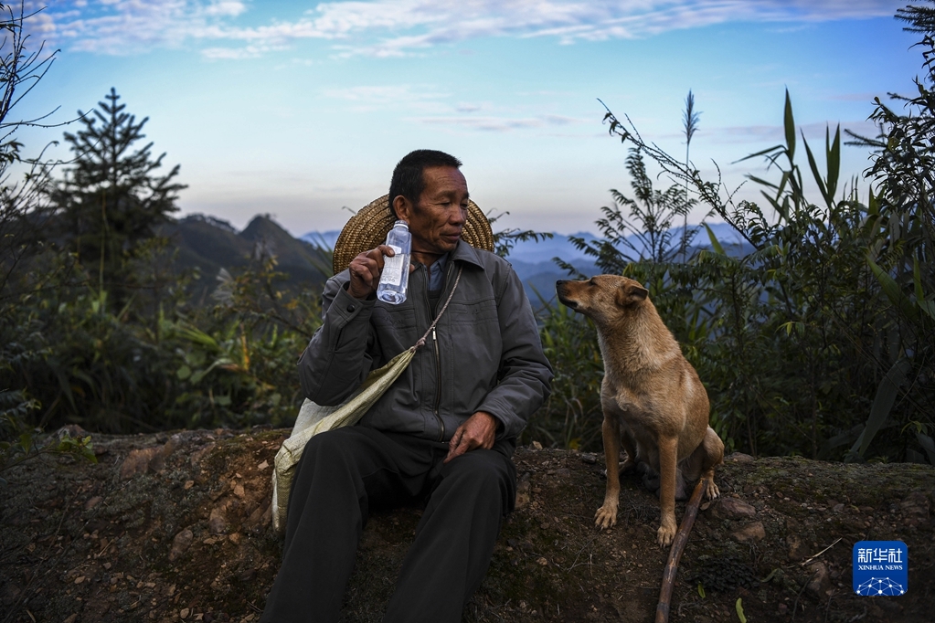 2021年11月24日,護(hù)林員雷其元在山頂休息。雷其元是廣西武宣縣東鄉(xiāng)鎮(zhèn)屯應(yīng)村的一名村級(jí)護(hù)林員,管護(hù)著約5800畝公益林。