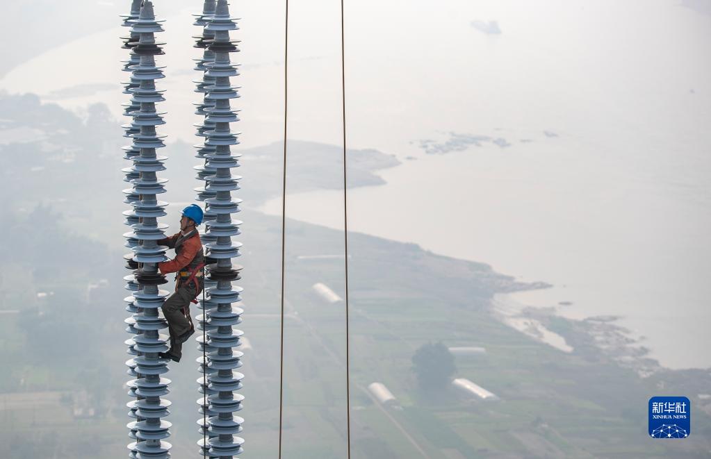 2021年12月5日,在白鶴灘—江蘇±800千伏特高壓直流輸電線路工程(重慶段)江津長(zhǎng)江大跨越施工現(xiàn)場(chǎng),工人在長(zhǎng)江上空作業(yè)。
