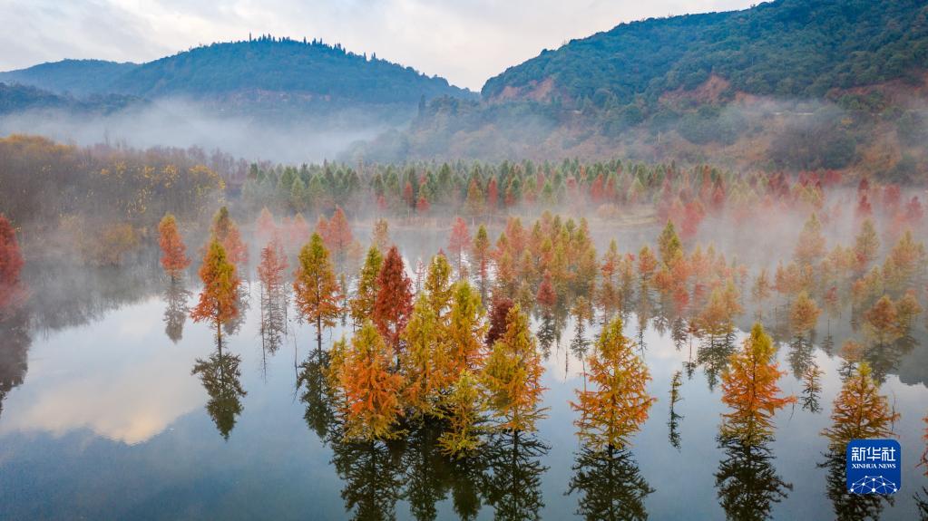 2021年12月10日拍攝的云南省昆明市盤龍區(qū)滇源街道甸尾村水杉濕地一景(無人機照片)。
