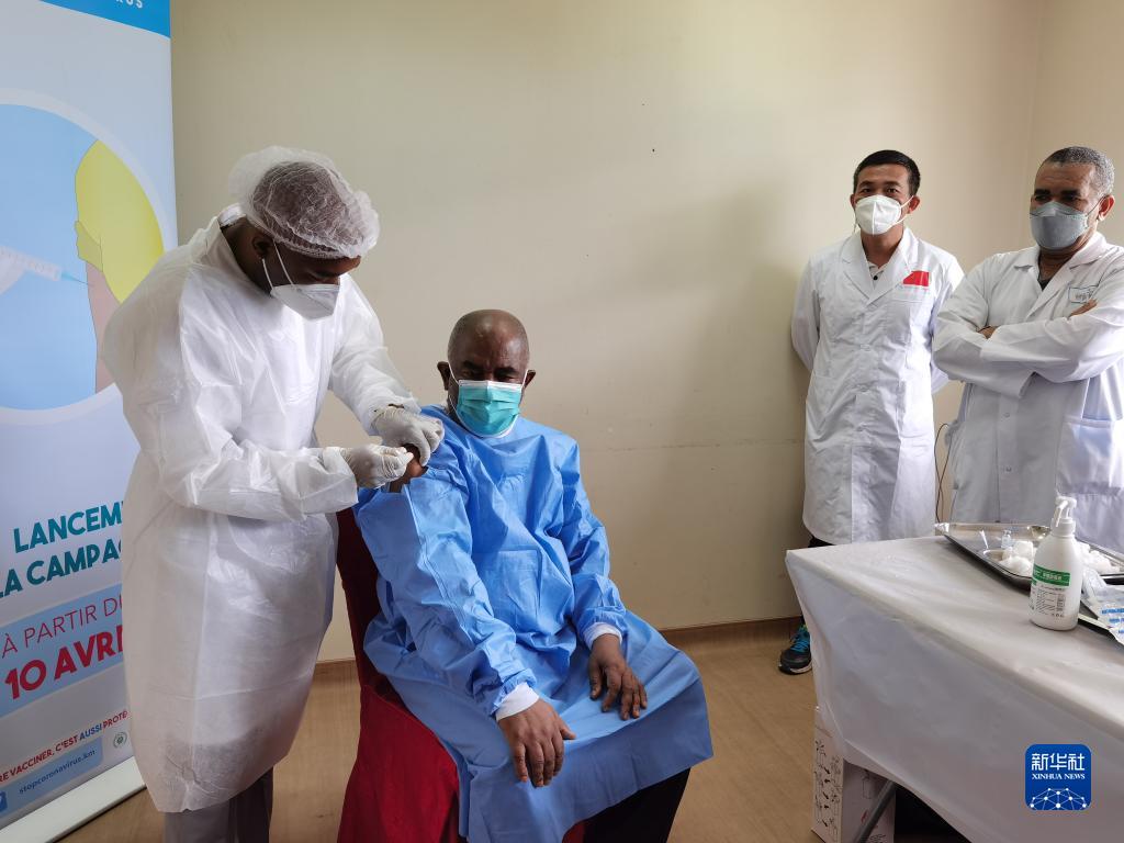 2021年4月10日,科摩羅總統阿扎利(左二)在首都莫羅尼北部的埃爾·馬魯夫醫院接種由中國國藥集團生產的新冠疫苗。
