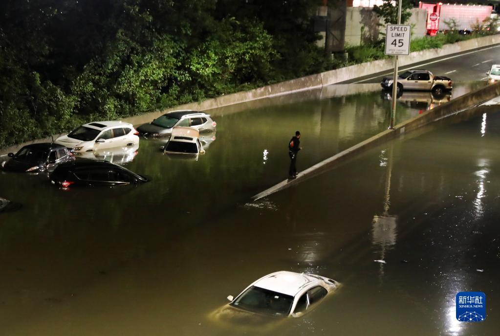 2021年9月2日,在美國紐約的一條主要道路,車輛被暴雨造成的積水淹沒。颶風“艾達”橫掃美國東部各州,所過之處生命財產損失慘重。
