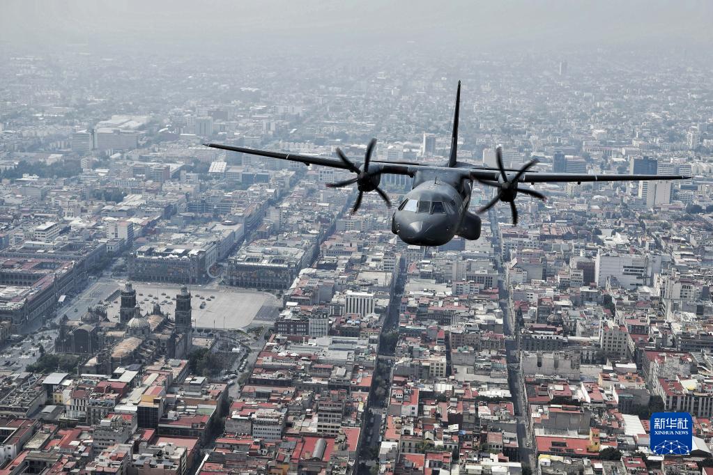 2021年9月16日,參加閱兵式的空軍飛機飛過墨西哥首都墨西哥城憲法廣場的上空。當天,墨西哥在首都墨西哥城舉行閱兵式慶祝獨立日。