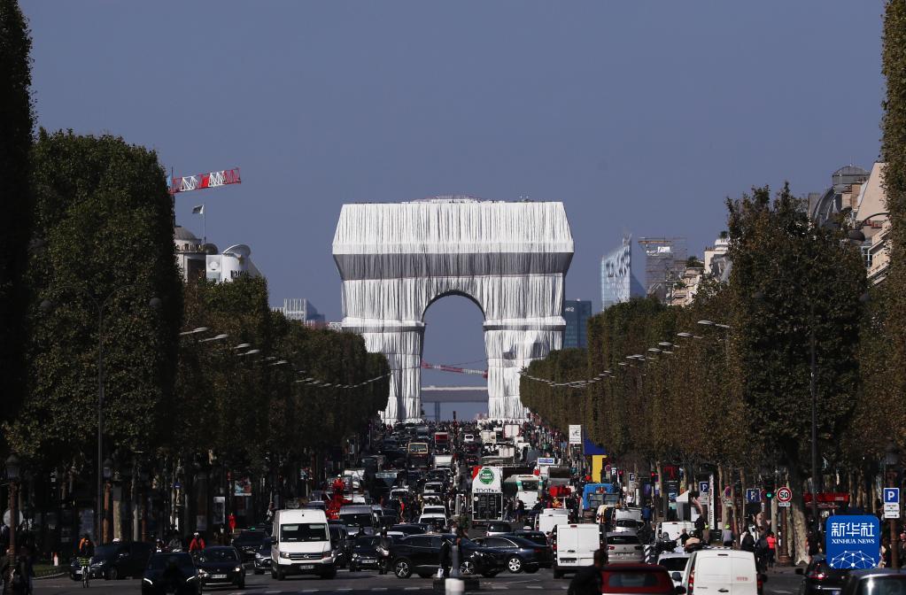 這是2021年9月21日在法國巴黎拍攝的“被包裹的凱旋門”。“被包裹的凱旋門”是保加利亞已故藝術家赫里斯托和妻子讓娜-克洛德的遺作。根據他們的構思,巴黎地標建筑凱旋門被可回收的織物包裹起來。