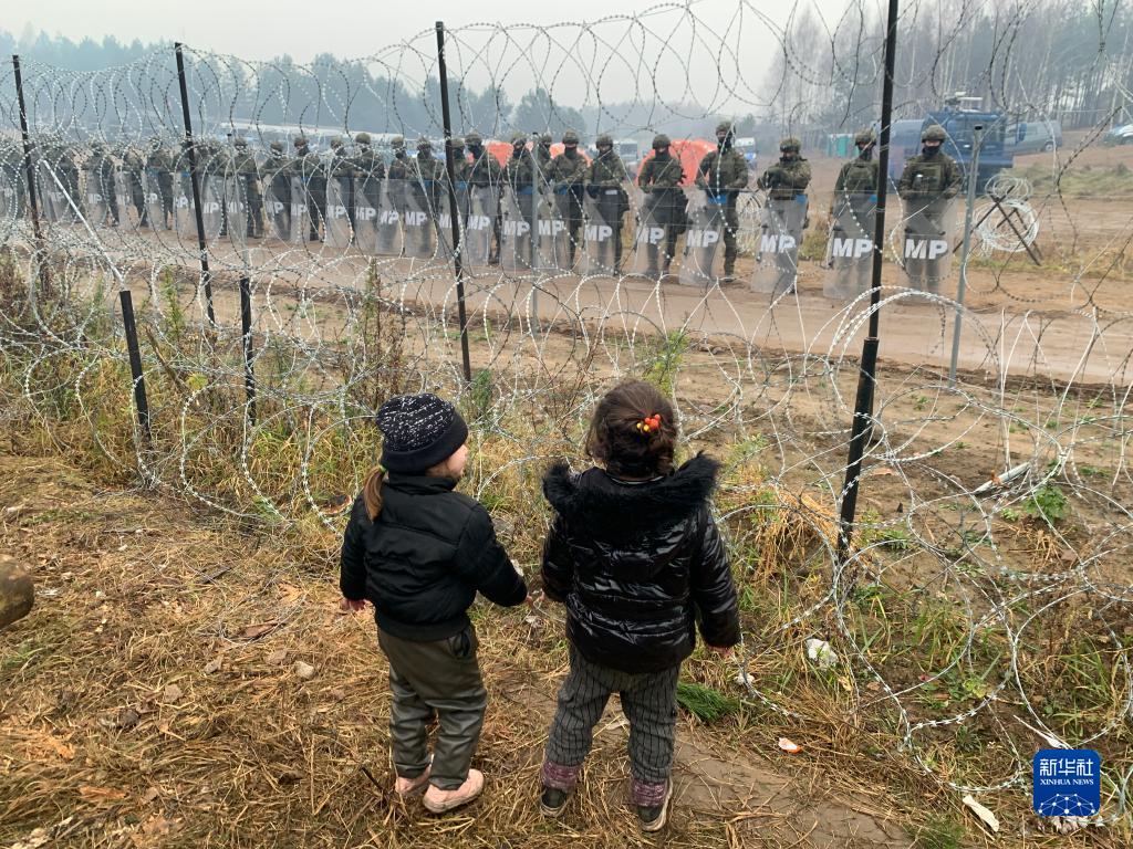 2021年11月14日,在白俄羅斯靠近波蘭邊境的一處難民點,兩名兒童透過邊境線上的鐵絲網(wǎng)遙望波蘭一側(cè)的軍人。