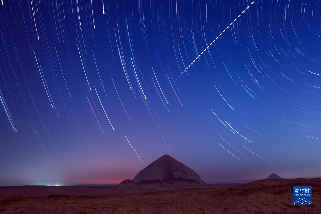 2021年11月26日在埃及首都開羅以南的彎曲金字塔附近拍攝的照片顯示,中國空間站劃過夜空(軌跡為多張照片堆棧)。2021年10月16日,神舟十三號載人飛船成功發射,開啟中國迄今時間最長的載人飛行。3名航天員將在中國天宮空間站核心艙在軌駐留6個月。