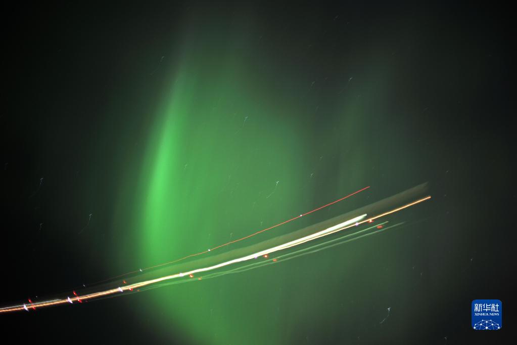 2021年3月20日凌晨,在美國阿拉斯加州安克雷奇,飛機飛過出現(xiàn)極光的天空(長時間曝光照片)。