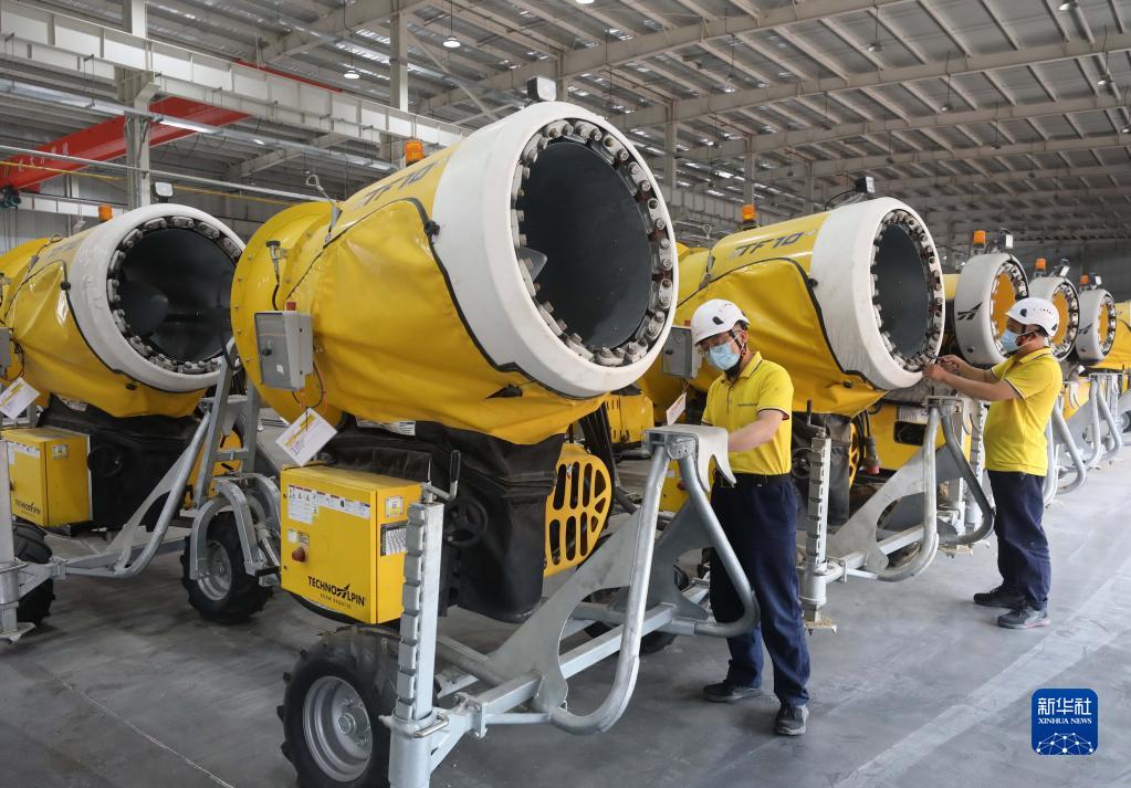 這是張家口高新區冰雪運動裝備產業園內一家冰雪設備企業的工人在車間查驗造雪機質量(2021年6月23日攝)。