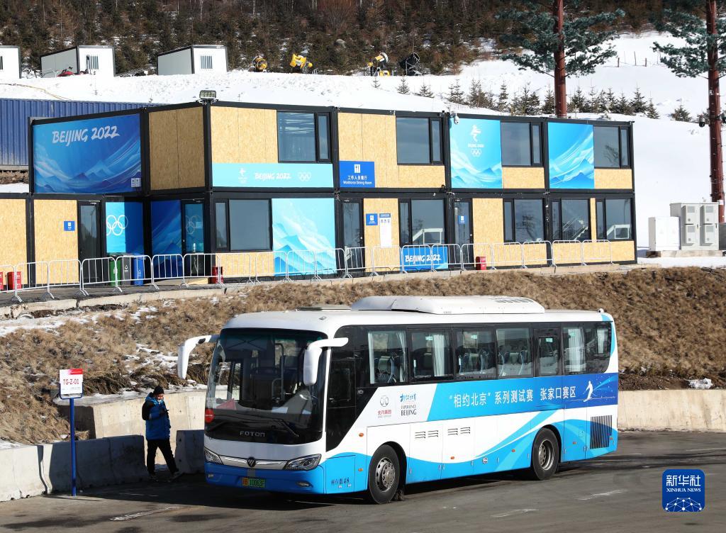 2022年1月6日,在張家口市崇禮云頂滑雪公園,一名工作人員準備乘坐氫燃料大巴出行。