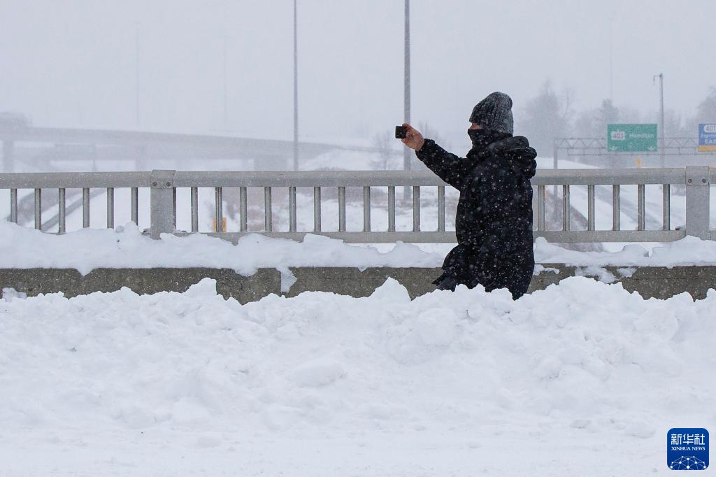 1月17日,在加拿大大多倫多地區米西索加,一名男子用手機拍攝雪景。