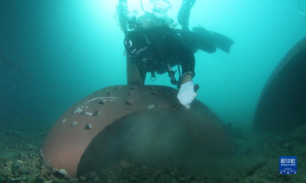 在亞龍灣相關海域,潛水員將人工生態礁沉入海底指定區域(1月19日攝)。