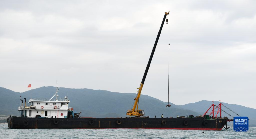 在亞龍灣相關海域,船上機械將人工生態礁吊入海中(1月19日攝)。