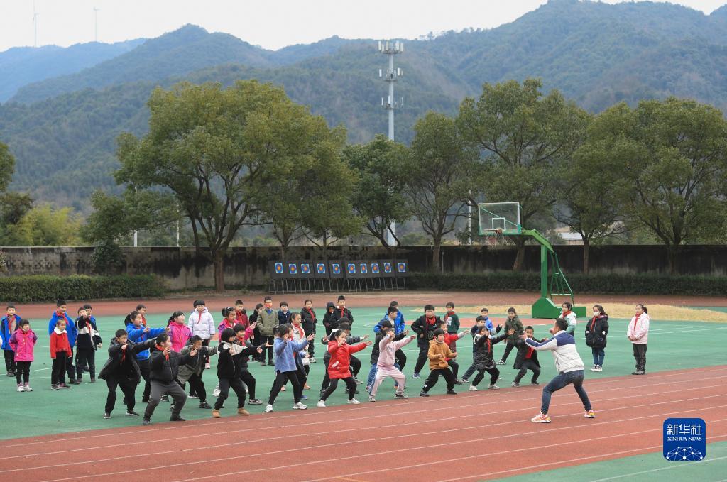 1月21日,在前童鎮中心小學,童攀峰帶領學生們開展舞獅基本動作訓練。