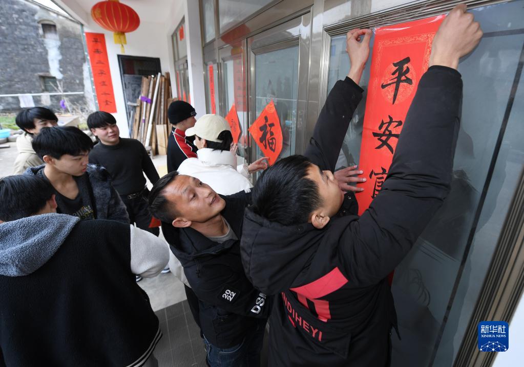 1月21日,在前童鎮橋頭楊村,舞獅隊成員在童攀峰家中幫老師貼春聯。