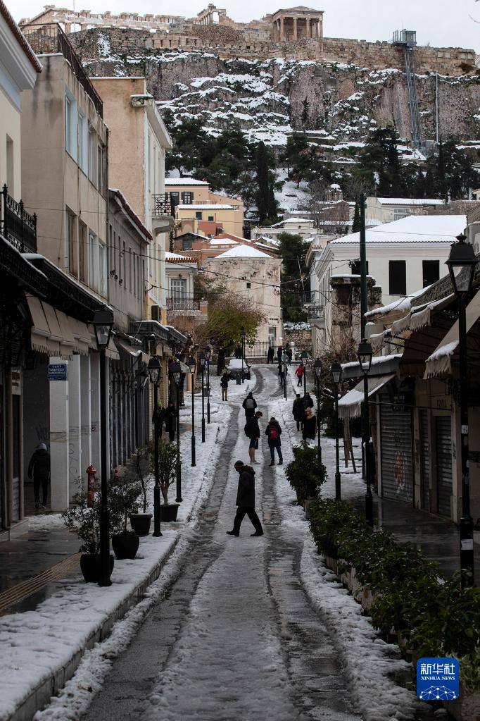1月25日,人們在希臘雅典的雪地上行走。