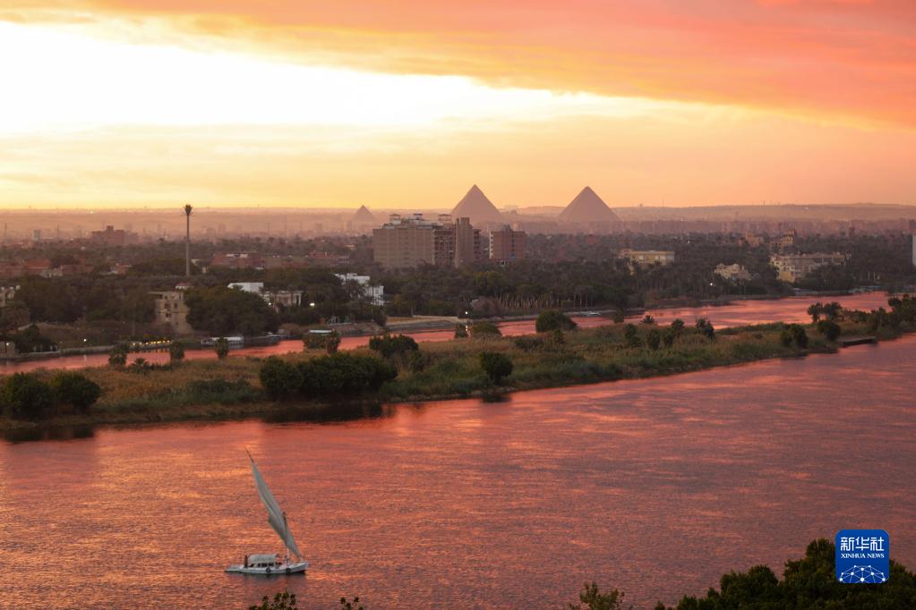 1月26日,一艘帆船行駛在埃及開羅被霞光映紅的尼羅河上。
