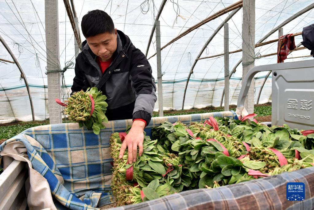1月31日,在河北省邢臺市南和區(qū)賈宋鎮(zhèn)郄村,宋建飛把采收的菠菜裝車。